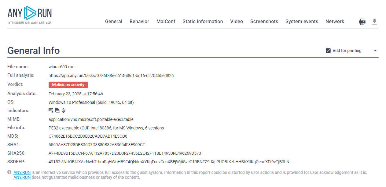 From the ANY.RUN report, the file is identified as a PE32 executable (GUI) for Windows, mimicking a WinRAR installer. Despite the "Malicious activity" verdict, key indicators suggest it's benign:
