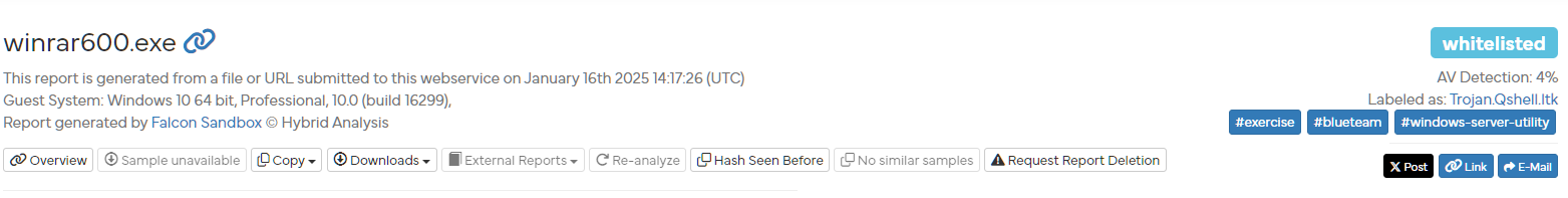 - Network activity: Contacted domains and IPs (e.g., win-rar.com) are whitelisted and legitimate.