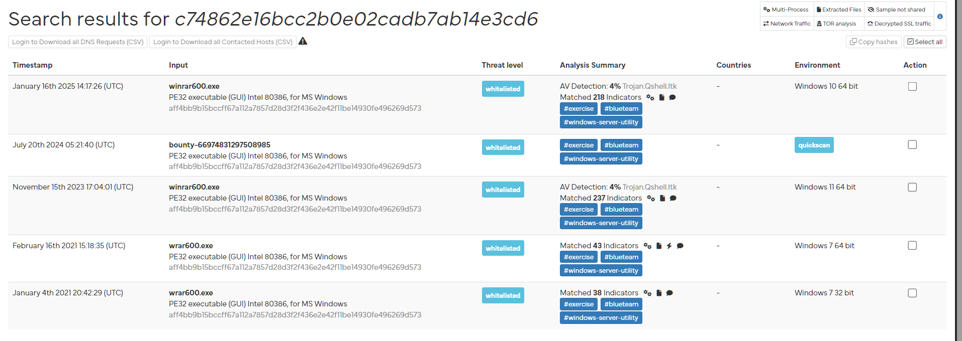 For further confirmation, we query Hybrid Analysis. All reports for the hash return a "whitelisted" threat level, with no malicious indicators in the most recent submission.