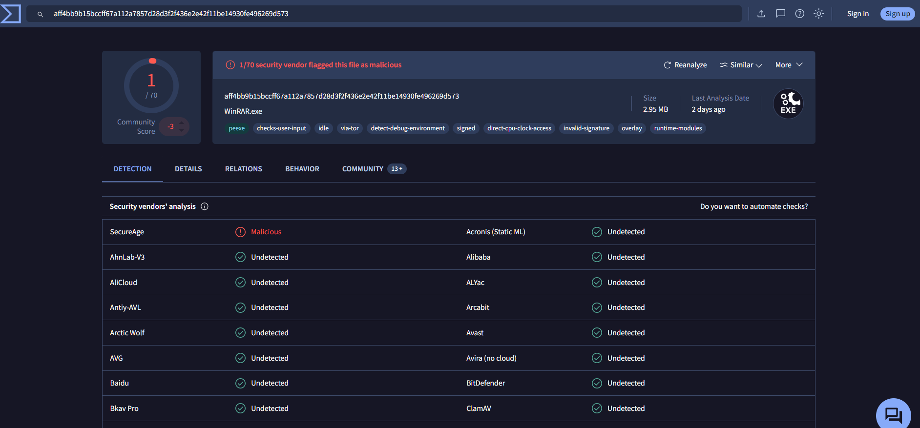 Next, we check VirusTotal for static analysis. The hash scores 1/70 detections, with only one vendor (SecureAge) flagging it as malicious—highly indicative of a false positive.