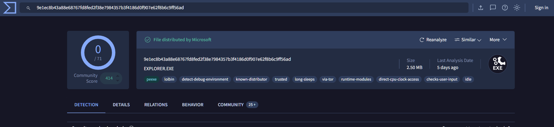 - Parent Process MD5 (8b88ebbb05a0e56b7dcc708498c02b3e): Clean, matches genuine Windows Explorer.