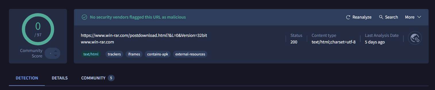 - Request URL (https://www.win-rar.com/postdownload.html?&L=0&Version=32bit): 0/97 detections, legitimate download page.